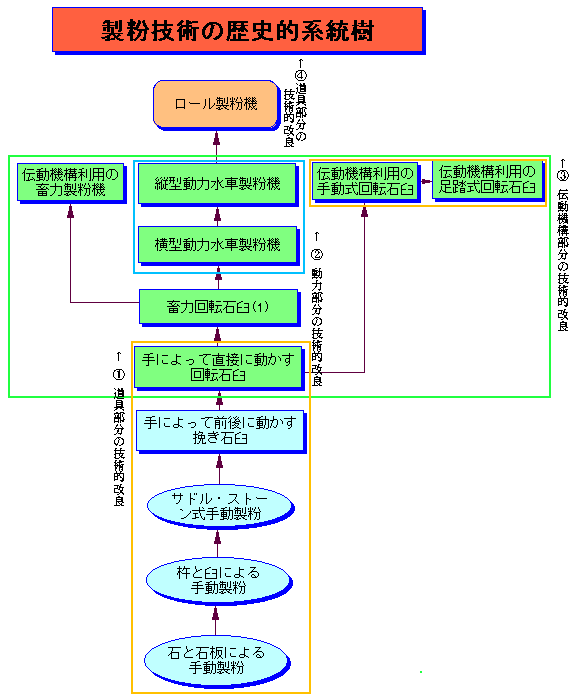 上記の画像ファイル「製粉技術の歴史的系統樹」の中のいくつかの項目には、その項目に対応する補足説明や補足画像があります。そうした項目の場所をクリックすると、対応するWebページが新規のWWWブラウザー画面として読み込まれますので、二つのWWWブラウザー画面を左右に並べて見て下さい。