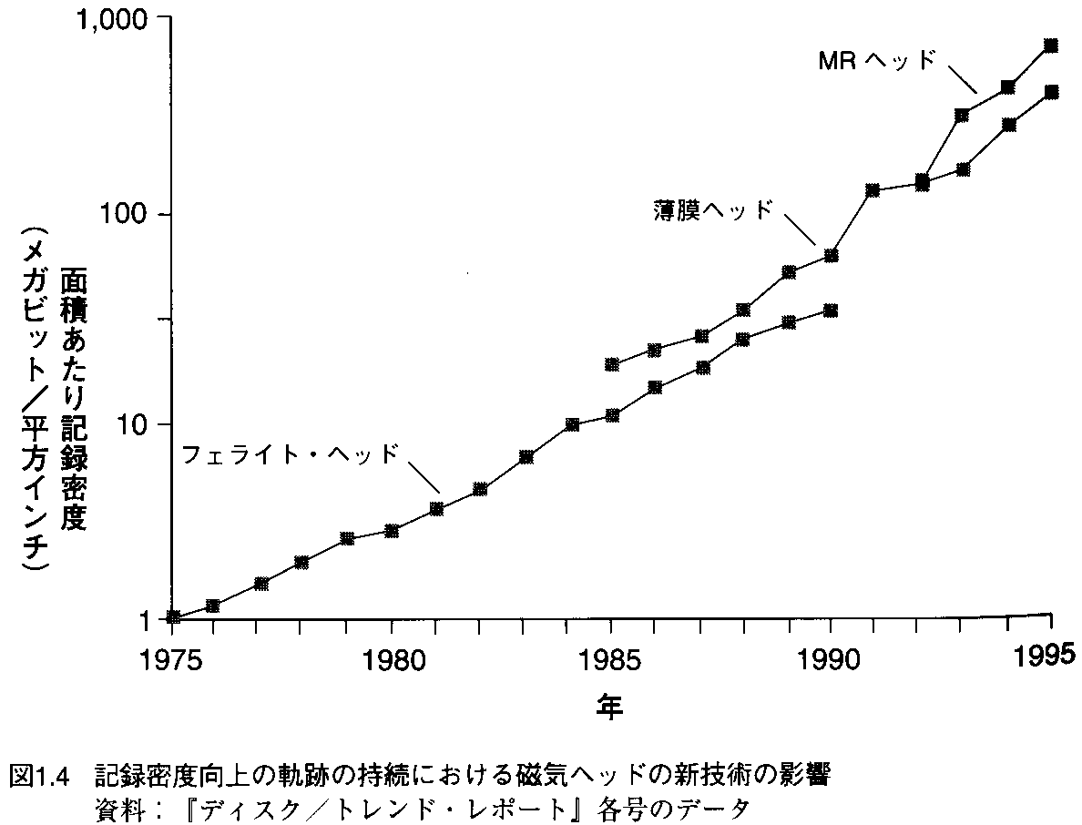 同一のValue Network内にあるイノベーションである限りは、それが抜本的イノベーションであろうとも、何らかの対抗手段は存在する場合が多い。例えば、HDDの読み取りヘッドに関するフェライトヘッド技術から薄膜ヘッド技術への抜本的イノベーションの場合には、下図に示されているように、古い技術であるフェライトヘッド技術でも、新しい技術である薄膜ヘッド技術と同様に記録密度の性能向上を図ることができた。それゆえ薄膜ヘッド技術への対応が遅れても致命的な問題になることはなかった。